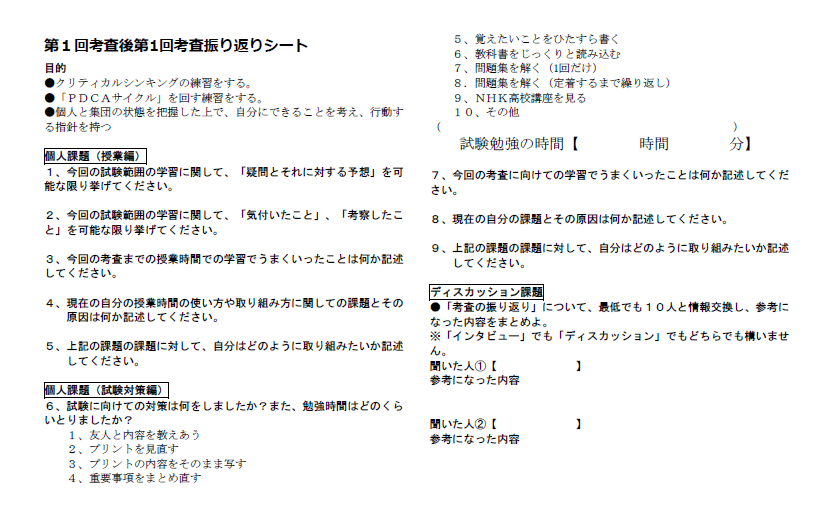 大野先生の授業では、生徒が自身の学習の進め方を振り返り、自分自身で学習のPDCAサイクルを回す場を、定期考査後に設けている。