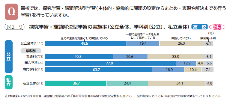 佐々木:「第6回学習指導基本調査」の結果を見て、総合学科では、探究学習・課題解決型学習の実施率が、普通科などに比べて有意に高いことを知りました。