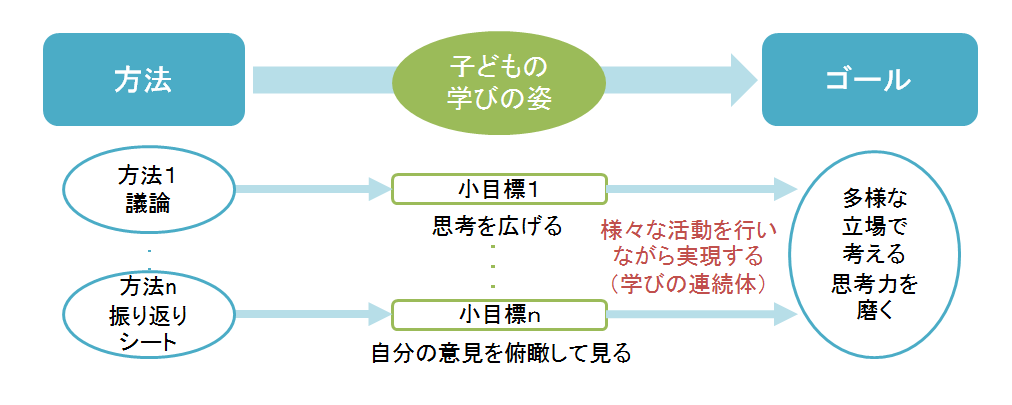 これからの授業のデザインは、教員がその授業で身につけさせたい教科の内容と資質・能力を明確に規定し、学習の内容や方法を検討することから始まります。「この単元や授業では、この資質・能力のこの部分を伸ばす」といったゴールを明確にし、そこに向けて、ここでは思考を広げたいとか、ここでは振り返りをさせたいなど、子どもの学びの姿をイメージしながら、小さな目標を設定していきます。そして、それらを"学びの連続体"として、授業全体をデザインしていくのです(図参照)。