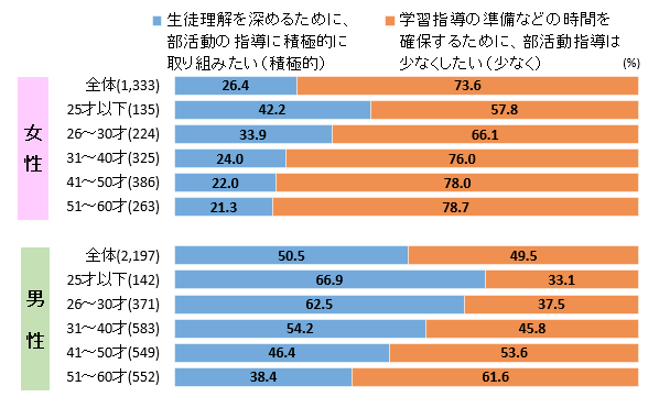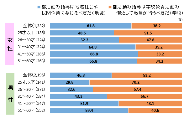 このように、部活動指導のあり方は「担い手」も「関わり方」も、教員の間で考え方が大きく分かれているうえに、性別や年齢別でも考え方が違っていることがわかった。