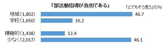 つまり、部活動指導は「学校」で自分も「積極的」にと考えている教員にはそれほど負担ではないし、部活動指導は「地域」で自分の関わりは「少なく」と考えている教員にはかなりの負担になっているというように、部活動指導のあり方に対する考え方の違いで部活動指導の負担感のもち方は大きく違うのだ。