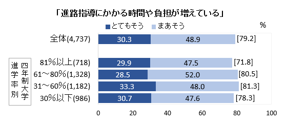 図2 「進路指導にかかる時間や負担が増えている」と感じる割合(全体・四年制大学進学率別〔公立普通科〕)