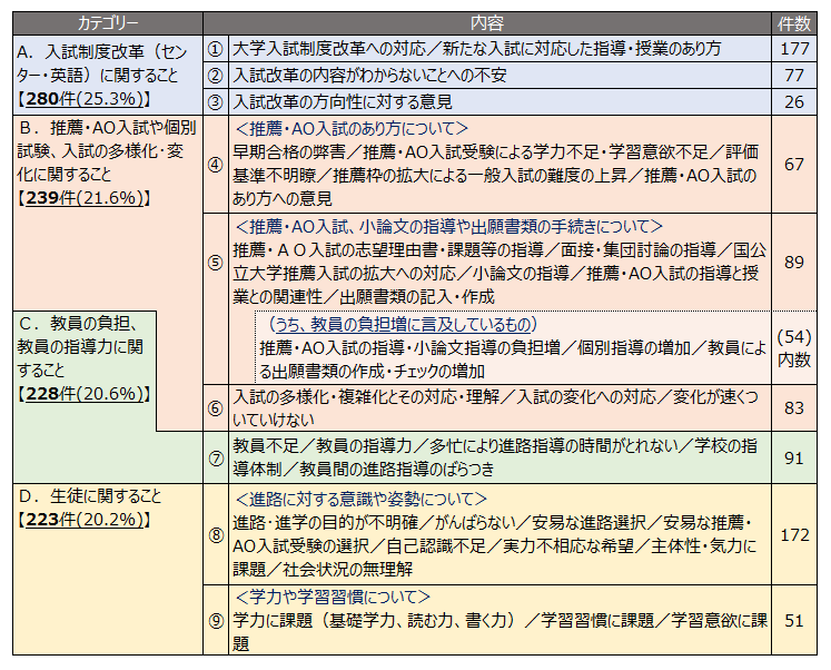 これらをみると、大きく3つのポイントがあることがわかる。1つは、センター入試にかわる新テストなど2020年の入試制度改革に関すること(表1A)、2つ目は、主に個別選抜に関して、推薦・AO入試や入試の多様化への対応と教員の負担に関すること(同B・C)、3つ目は、生徒の進路選択に対する意識や学力(同D)に関することである。