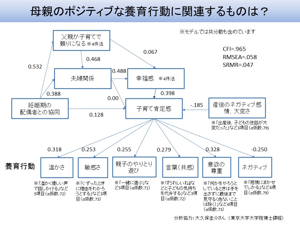 つまり、ポジティブな養育行動の実現には、妊娠期の夫婦の協同性を高めたり、母親の産後の大変さを軽減したりする支援を通して、子育てに前向きな気持ちや自信(子育て肯定感)を育むことが大切であるといえるかもしれません。