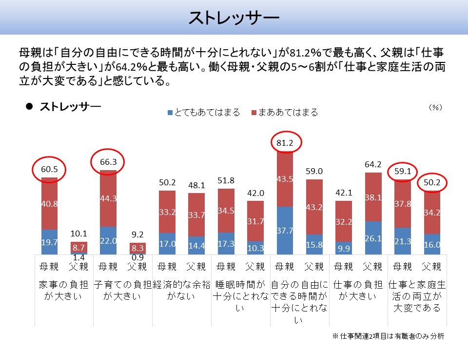 調査結果からは、子育て・家事ともに、母親が中心的に担っているという現状がうかがえます。実際、生活における負担感を尋ねたところ、母親からは、「自分の自由にできる時間が十分にとれない」「子育ての負担が大きい」「家事の負担が大きい」といった回答が目立ちました(図21)。また、仕事をしている母親・父親では、「仕事と家庭生活の両立が大変である」が半数を超えました。