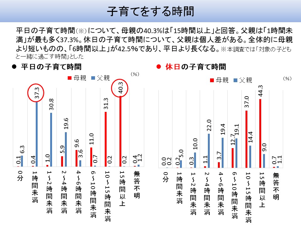 子育てや家事にかける時間、自由に過ごせる時間といった、母親・父親の生活のあり方を見ていきます。なお、本調査では、「子育てをする時間」(以下、子育て時間)を、調査の対象となる子どもと過ごす時間(睡眠時間を除く)と定義しています。