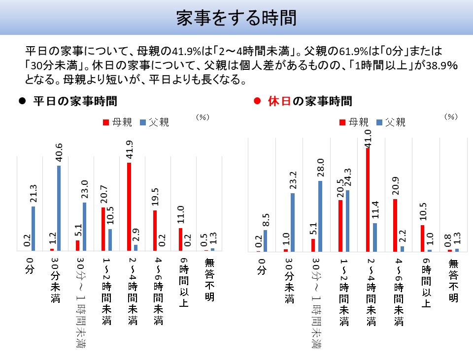 子育て時間・家事の時間ともに、母親・父親で大きな差が見られ、平日では、母親のほうが圧倒的に長くなりました(図17・図18)。休日では、父親の子育て時間・家事の時間は全体的に平日よりも長くなりましたが、それでも、母親よりは短い傾向がありました。