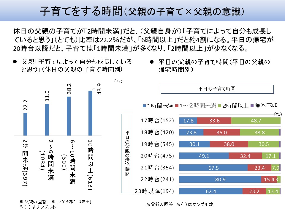 父親の平日の子育て時間は、帰宅時刻と密接に関係しています。20時より前に帰宅する父親では、2時間以上子育てをするという人が3割を超えたのに対し、20時台以降に帰宅する父親では、子育て時間が1時間未満であるという人が増える傾向がみられました(図19)。