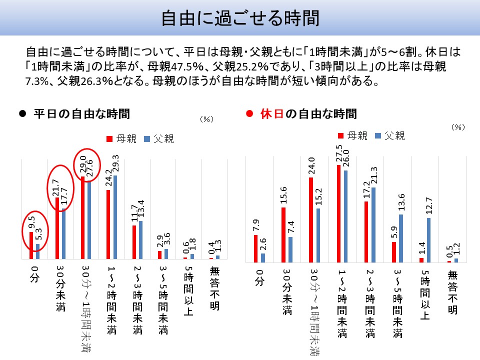一方、自由に過ごせる時間は、母親のほうが短くなる傾向があり、特に平日では、母親の約3割が、自由時間が全くなかったり、30分未満しかなかったりしていました(図20)。