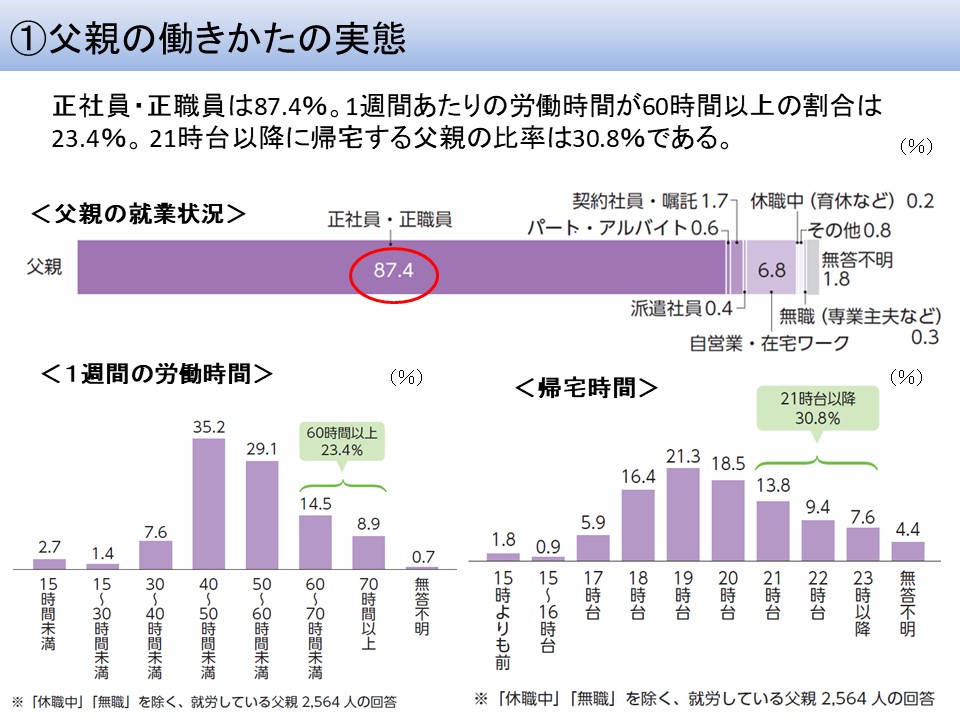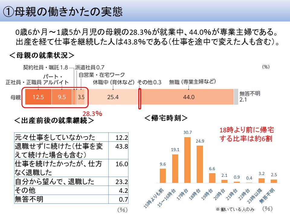 母親・父親が仕事と子育てを両立していく上で、現在、家庭も職場も様々な課題を抱えています。それら一つひとつの実態を明らかにし、解消するための具体的な支援策を検討していくことが、今後の重要課題と考えています。