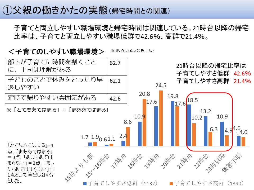 父親の帰宅時刻には、職場環境との関連が見られます。「部下が子育てに時間を割くことに、上司は理解がある」「子どものこと(病気の際や園の行事など)で休みをとったり早退しやすい」といった「子育てと仕事を両立しやすい職場環境」で働いている父親では、21時より前に帰宅する比率が圧倒的に高くなりました(図27)。仕事と子育ての両立支援制度は、企業の中でかなり広がっていますが、それだけでは十分ではなく、子育てに理解のある職場の風土や雰囲気、上司の存在が大切であることが分かります。