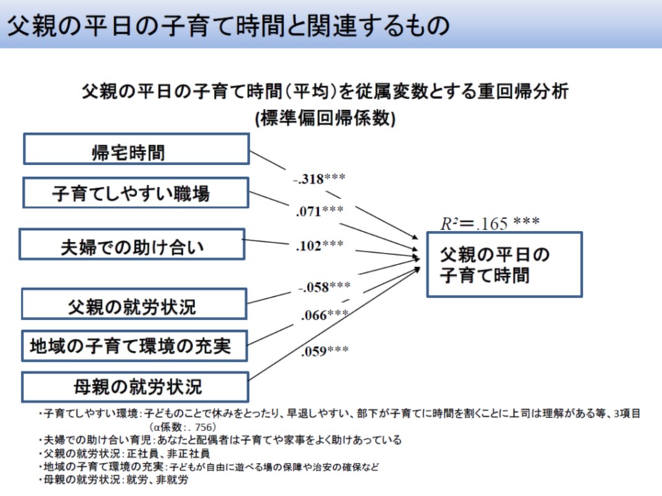 また、今回、平日の父親の子育て時間と関連する項目についての分析も行いましたが、その結果を見ると(図31)、父親が日常的に子育ての時間をもつためには、帰宅時間の早さや、それを支える子育てに理解のある職場環境が必要であり、また、夫婦での子育ての助け合いなどが大切であることが分かります。