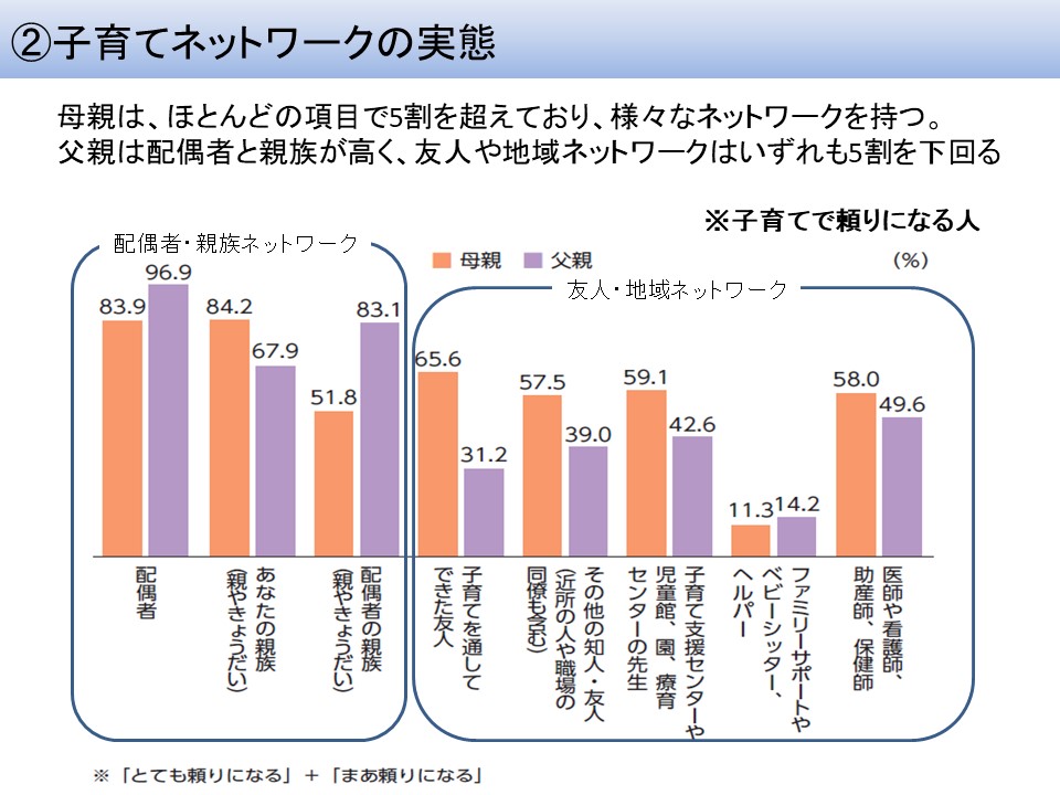 このように、平日、父親が子育てに参加しようとしても難しい現実がある中、夫婦は誰の協力を得て子育てをしているでしょうか。子育てのネットワークについて尋ねたところ(図28)、母親・父親ともに、「配偶者」や「親族(親やきょうだい)」を頼りにする比率が高く、「子育てを通してできた友人」「子育て支援センターや児童館、園、療育センターの先生」(以下、子育て支援センターや園の先生ら)を始めとする「友人・地域ネットワーク」を頼りにする比率は、母親で高くなりました。無職の母親では、子育てを通してできた友人、就業中の母親では、子育て支援センターや園の先生らを頼る比率が高く(図表略)、それぞれの生活において、子育てで頼りにできるネットワークを広げていることがうかがえます。