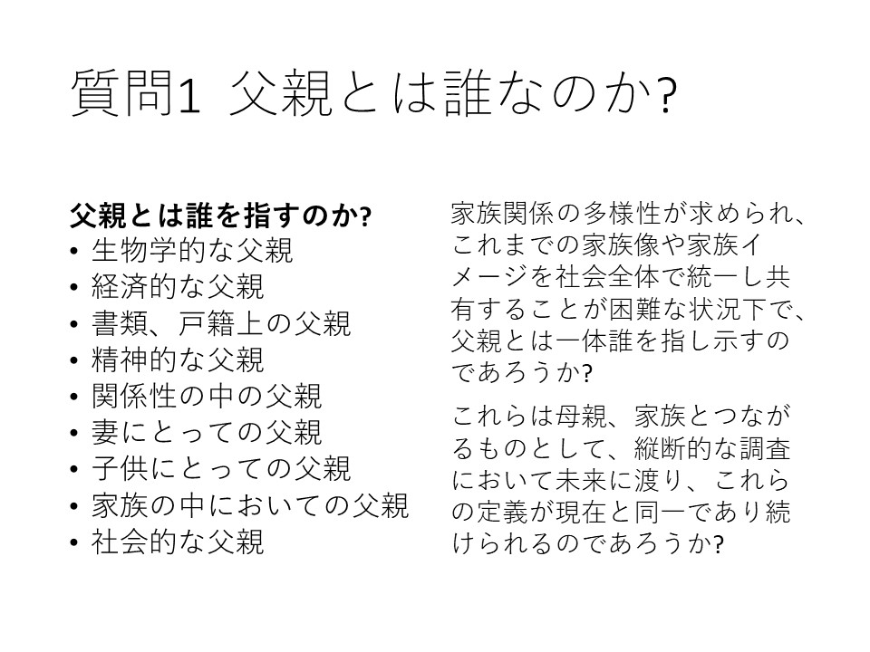 例えば、生物学的なものなのか、経済的なものなのか、法的なものなのか、精神的なものなのか、あるいは、それらすべての要件を満たすべきなのか、検討する必要があるでしょう。社会の変化は急速に進んでいますから、現在の「父親」の定義が、将来、そのまま通用するという保障はありません。そうした中で行われる長期縦断研究においては、父親とは誰なのかを考える意義は、なおさら大きくなるのではないでしょうか。