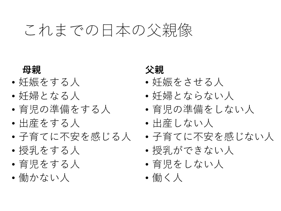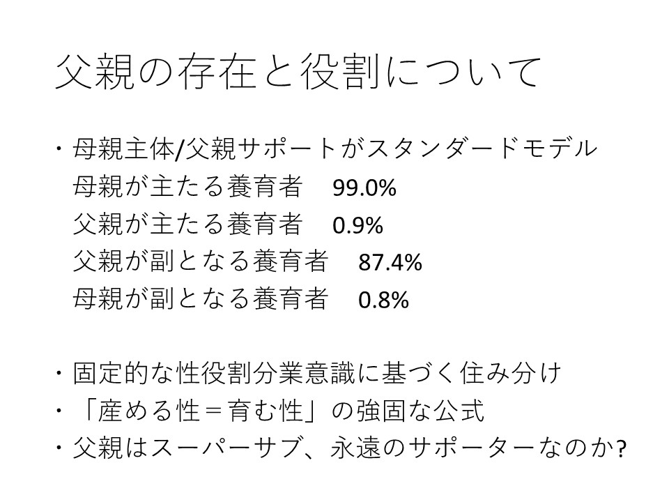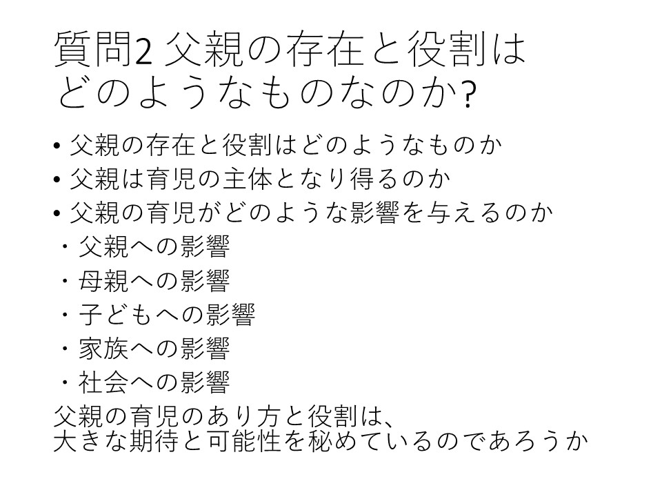 そこで、父親は子育ての主体となり得るのか、父親の子育ては家族にどのような影響を及ぼすのかといった、父親の存在と役割についての根源的なテーマと、しっかり向き合う必要があると思います。