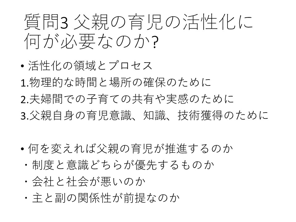 具体的な観点としては、まず、「物理的な時間と場所の確保のために」が考えられます。話題提供では、帰宅時間や子育て時間の問題が取り上げられ、島津教授の指定討論でも、日本の父親の子育て時間がいかに少ないか、国際的な比較によって示されました。また、男性の育児休暇取得率は5%台にとどまっており、その背景には、「取得しようとしても難しい」という事情があると考えられます。つまり、単に父親の意識だけの問題ではなく、社会全体で支援のあり方を検討していく必要があります。