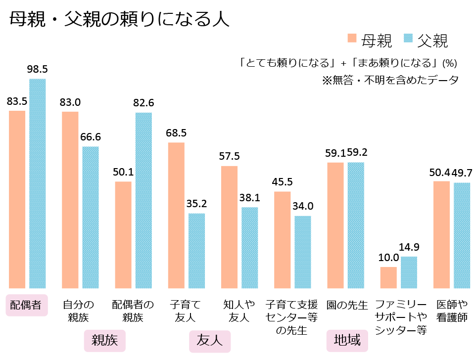 「チーム育児」では、母親・父親が配偶者とだけではなく、親族や友人、職場、地域といった周囲の様々な人たちとの協働が鍵になります。そこで、まずは、母親・父親が子育てにおいて誰を頼りにしているのかを見ていきます。