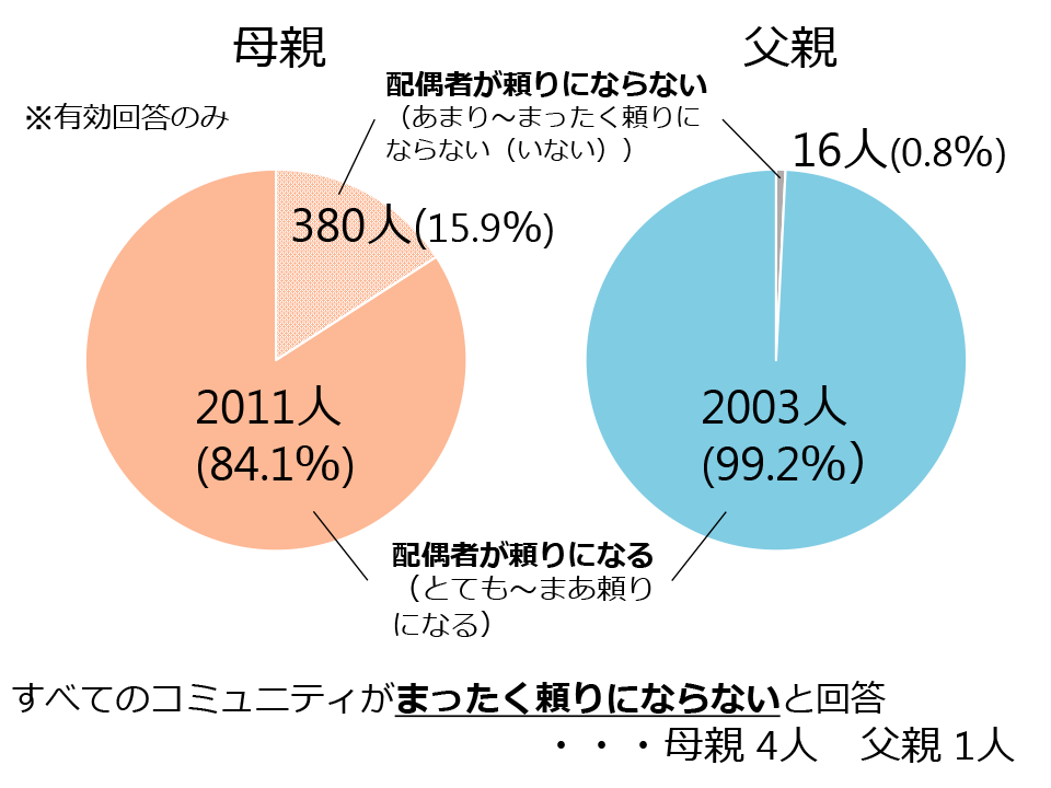一方、「配偶者が頼りにならない」という母親・父親も見られます。その割合は、父親では0.8%ですが、母親では15.9%でした(図16)。