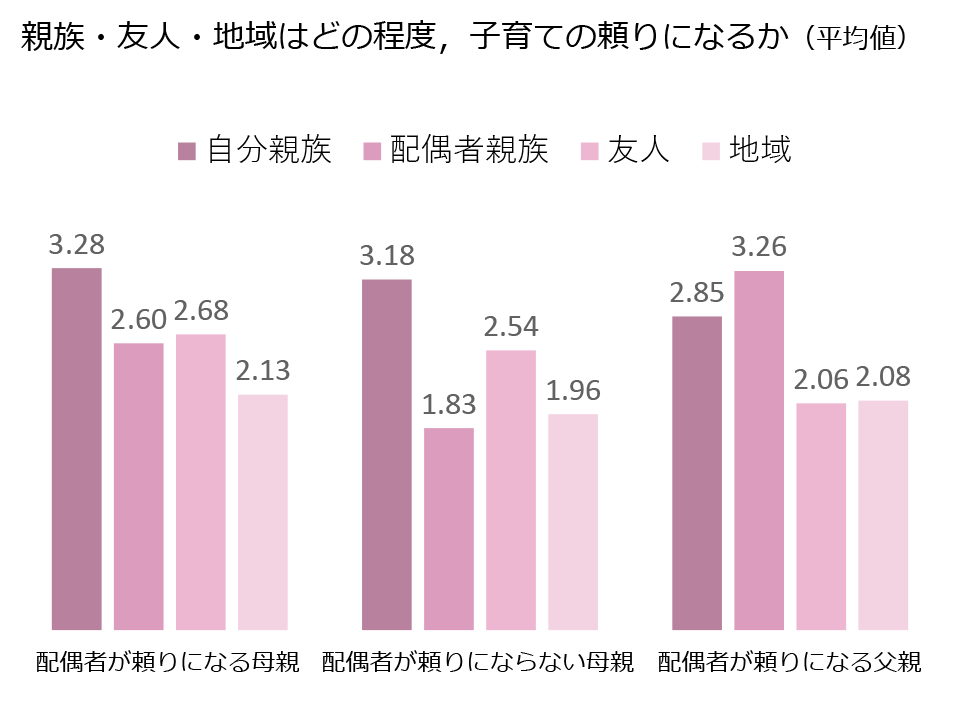 そこで、①配偶者が頼りになる母親、②配偶者が頼りにならない母親、③配偶者が頼りになる父親の3つに分け、配偶者を除く子育てコミュティがどの程度頼りになるかをたずねたところ、「配偶者の親族」について興味深い結果が得られました。配偶者が頼りになる母親では2.60ポイントですが、配偶者が頼りにならない母親では1.83ポイントでした。配偶者が頼りにならない母親は、配偶者だけではなく、その親族も頼りにならないと感じる傾向にあることがわかります(図17)。