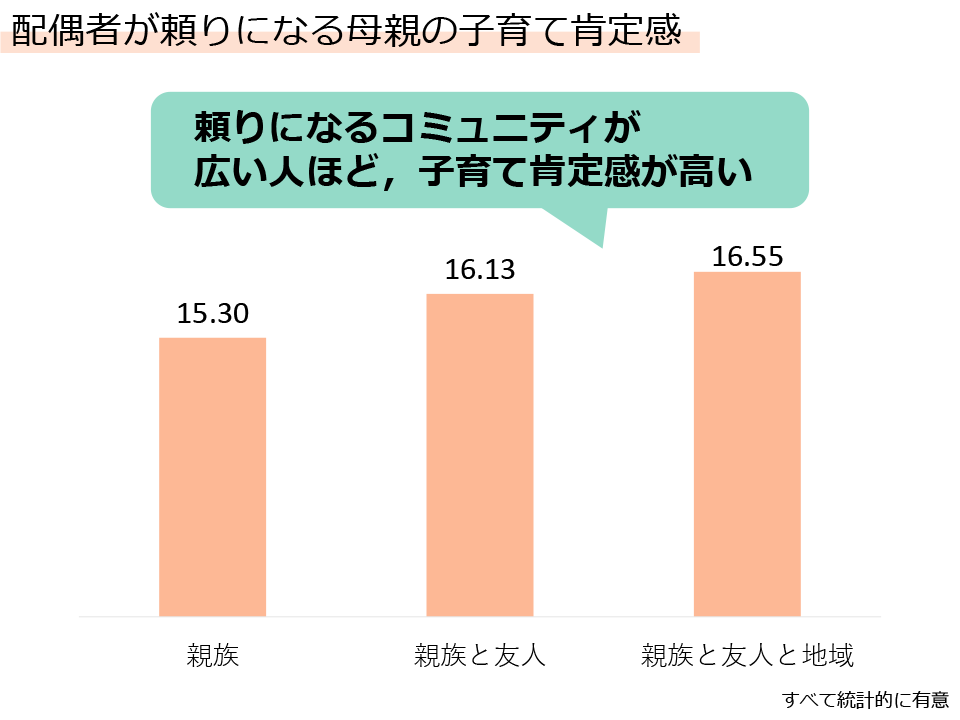 では、母親・父親が「子育てコミュニティが頼りになる」と感じていることは、子育てにどのように影響するのでしょうか。配偶者以外の子育てコミュニティについて子育て肯定感との関連を分析し、統計的に意味のある結果に絞ってご紹介します。