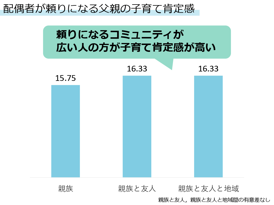 配偶者が頼りになる母親では、「自分の親族」「子育てを通じてできた友人」「知人や友人」「園の先生」が、子育て肯定感を向上させる傾向が見られました。また、頼りになるコミュティが広い人ほど、子育て肯定感が高いこともわかりました(図18、19)。