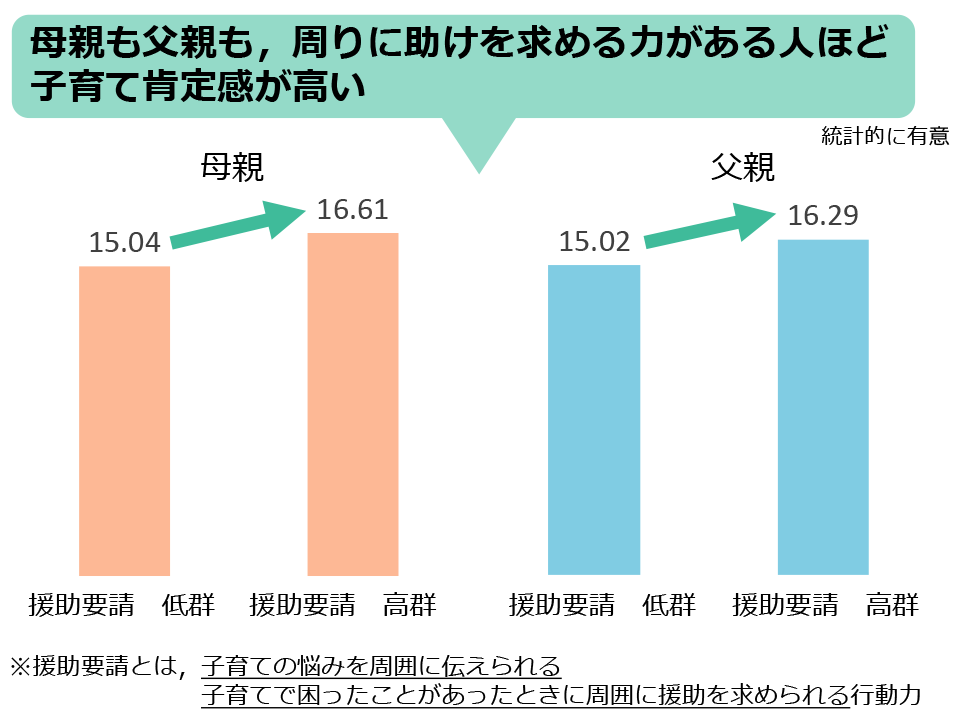 また、配偶者が頼りになる父親でも、配偶者が頼りになる母親と同じように、頼りになるコミュティの広さと子育て肯定感の高さに関連が見られました(図22)。このように、周囲からの支援は子育て肯定感にポジティブに影響していますが、それは、困ったことが起きた時に自ら周囲に助けを求める力である「援助要請スキル」とも関連しているようです。本調査では、母親・父親ともに、援助要請スキルが高い人のほうが、高い子育て肯定感を得ていることがわかっています(図23)。