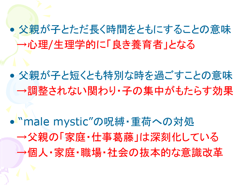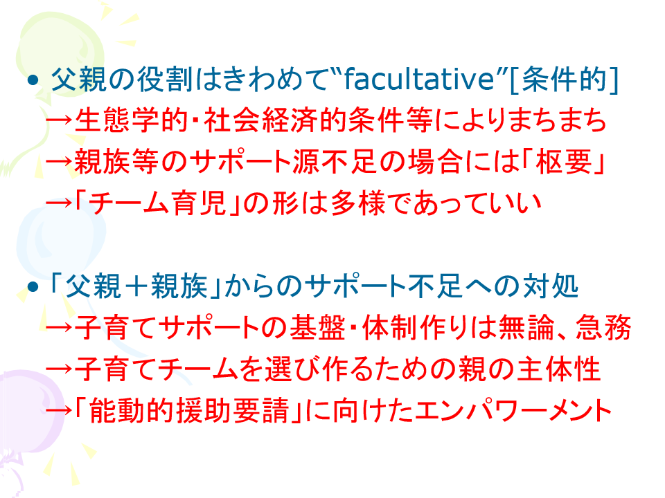 子育てコミュニティを取り上げた李研究員の発表からは、子育てにおける父親の役割を考えさせられました。父親の子育てへのかかわり方は、社会によって多様なのですが、母親が、親族や友人、地域といった父親以外の子育てコミュニティからの支援を受けられなくなると、どの社会でも父親の重要性が高まります。そうした状況で、父親から思うような支援が得られないと子どもの発達環境は悪化してしまいます。