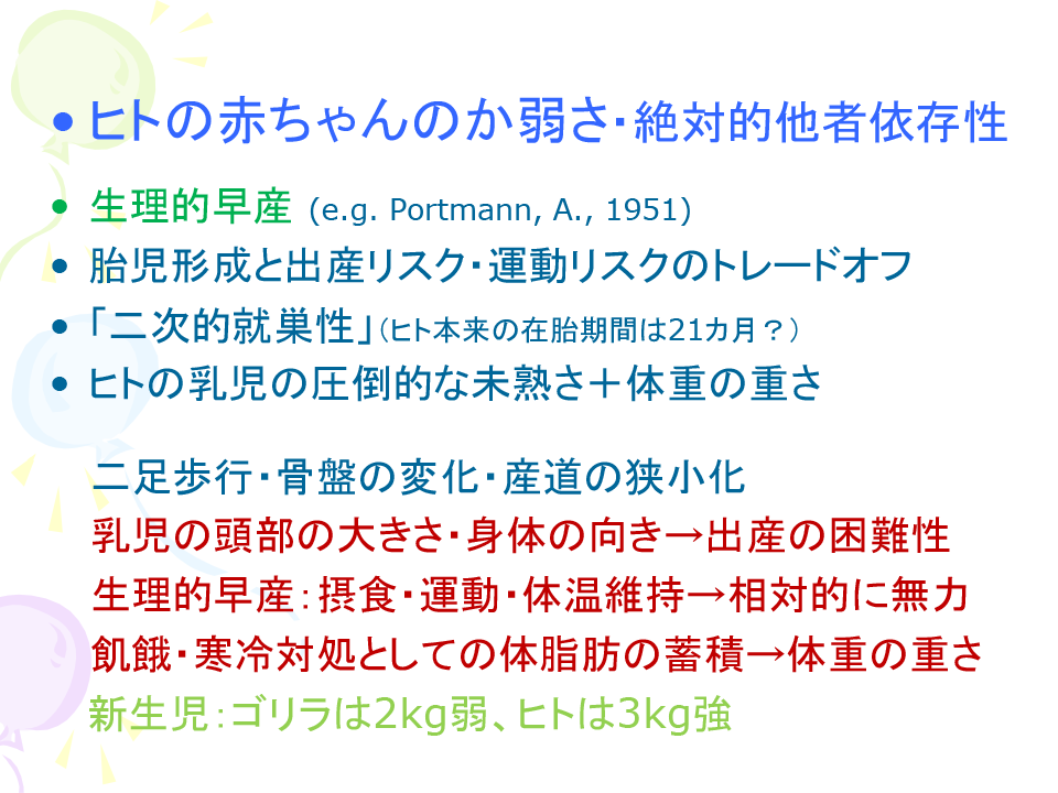 人類の赤ちゃんは、ほかの哺乳動物の赤ちゃんに比べて、格段に手がかかります。その要因の1つは、生理的な早産化にあります(図3)。人類は、二足歩行を始めた影響により、骨盤が大きく変化しました。そうした中、女性の産道が狭くなり、お腹の中で赤ちゃんが大きくなりすぎると出産するのが難しくなるため、赤ちゃんがお腹の中にいる期間(在胎期間)が短くなっていきました。人類の赤ちゃんは、かなり未熟な、手がかかる状態で生まれてきているのです。