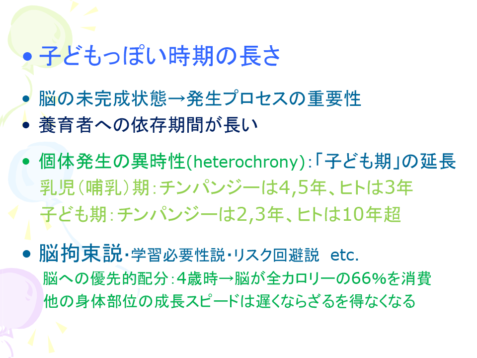 また、人類の子どもは、「乳児期」を終えてから第二次性徴が表れるまで、十数年もの長きにわたって「子ども期」が続きます(図4)。その間は、大人が子どもに食料を与えたり、子どもの安全を保障したりする必要があるため、人類の子どもは、手がかかる期間も長いことになります。