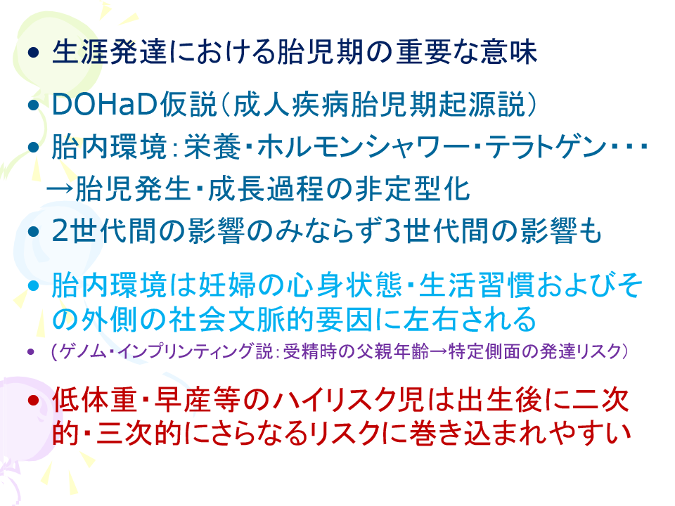 大久保研究員が発表した妊娠期からの支援の重要性は、極めて示唆に富むものでした。例えば、現在の発達研究では、心臓血管系の病気や糖尿病といった様々な病気の要因は、胎内環境にあるとする「成人疾病胎児期起源説」が注目を集めており、同説に従えば、胎内環境を健全に保つことは、人間の一生における心身の健康の鍵を握っています。胎内環境は妊婦の心身の状態によって変化するため、配偶者や周囲の人たちによる支援が大切になることは言うまでもありません(図7、8)。