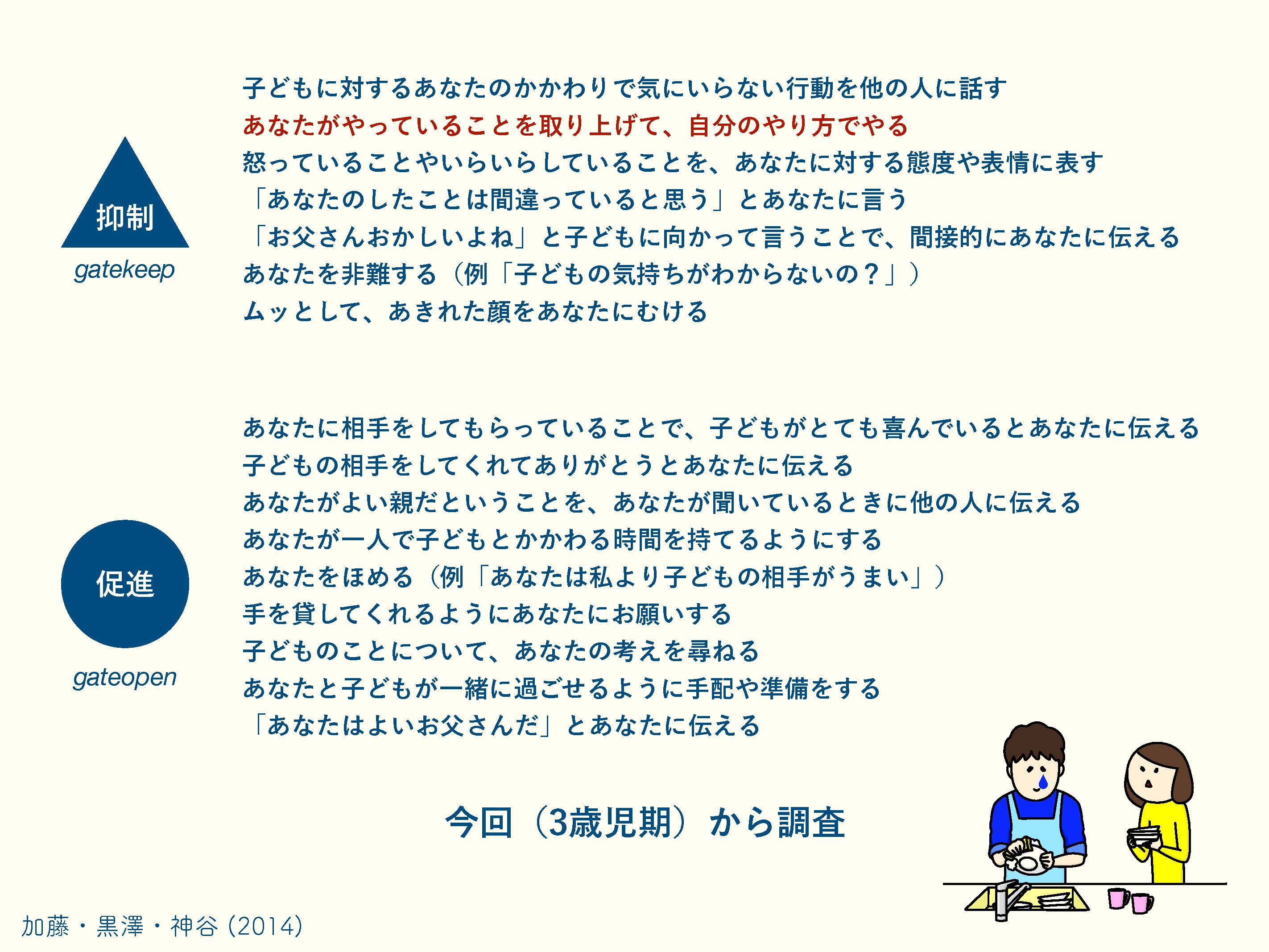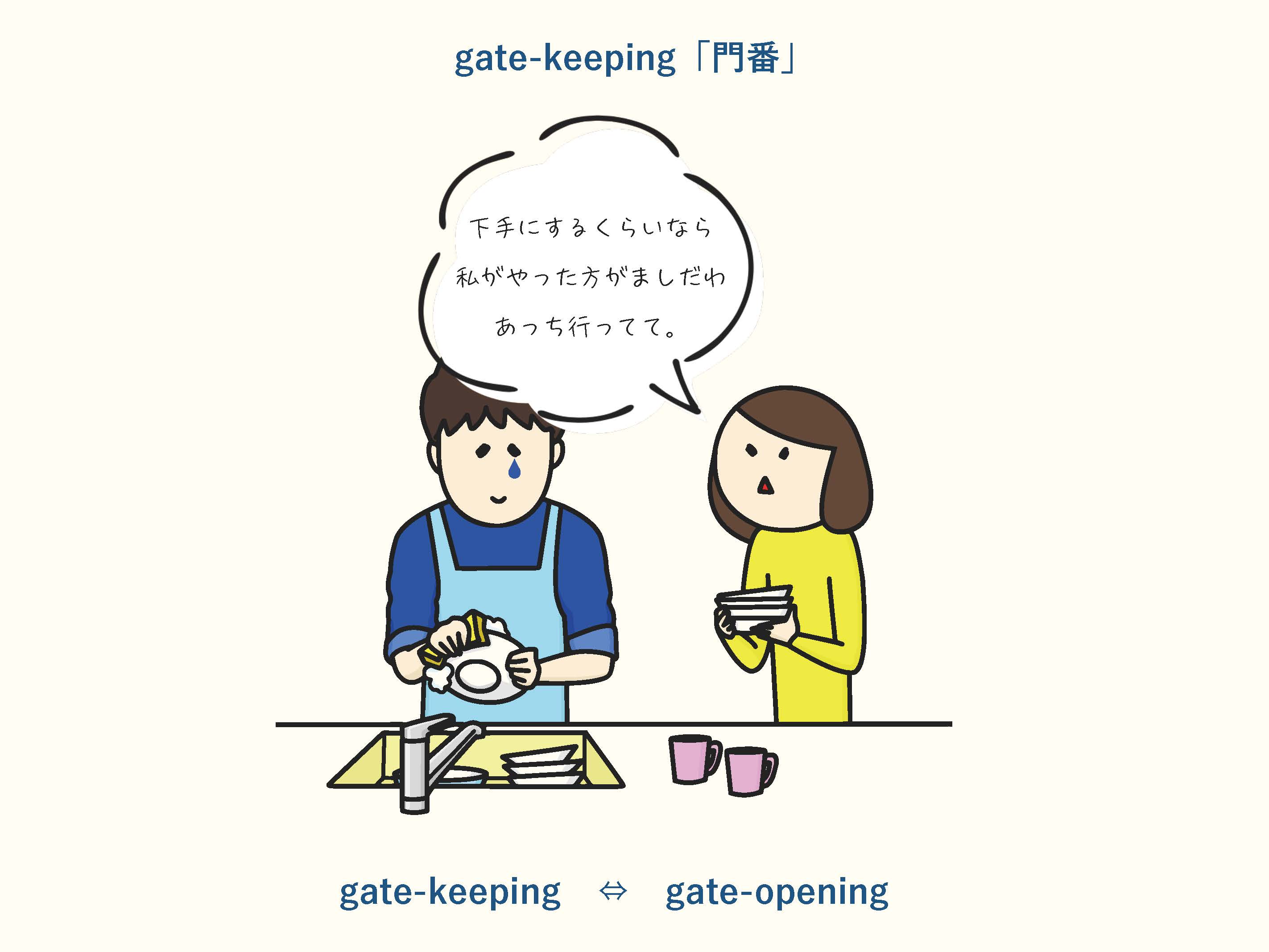 日本で「イクメン」という言葉が聞かれるようになる以前から、海外では心理学の分野などでそうした行動についての研究が行われていました。対義語として、ゲートオープニングという言葉があり、こちらは父親の家事や育児を促進するような母親の行動を指します。