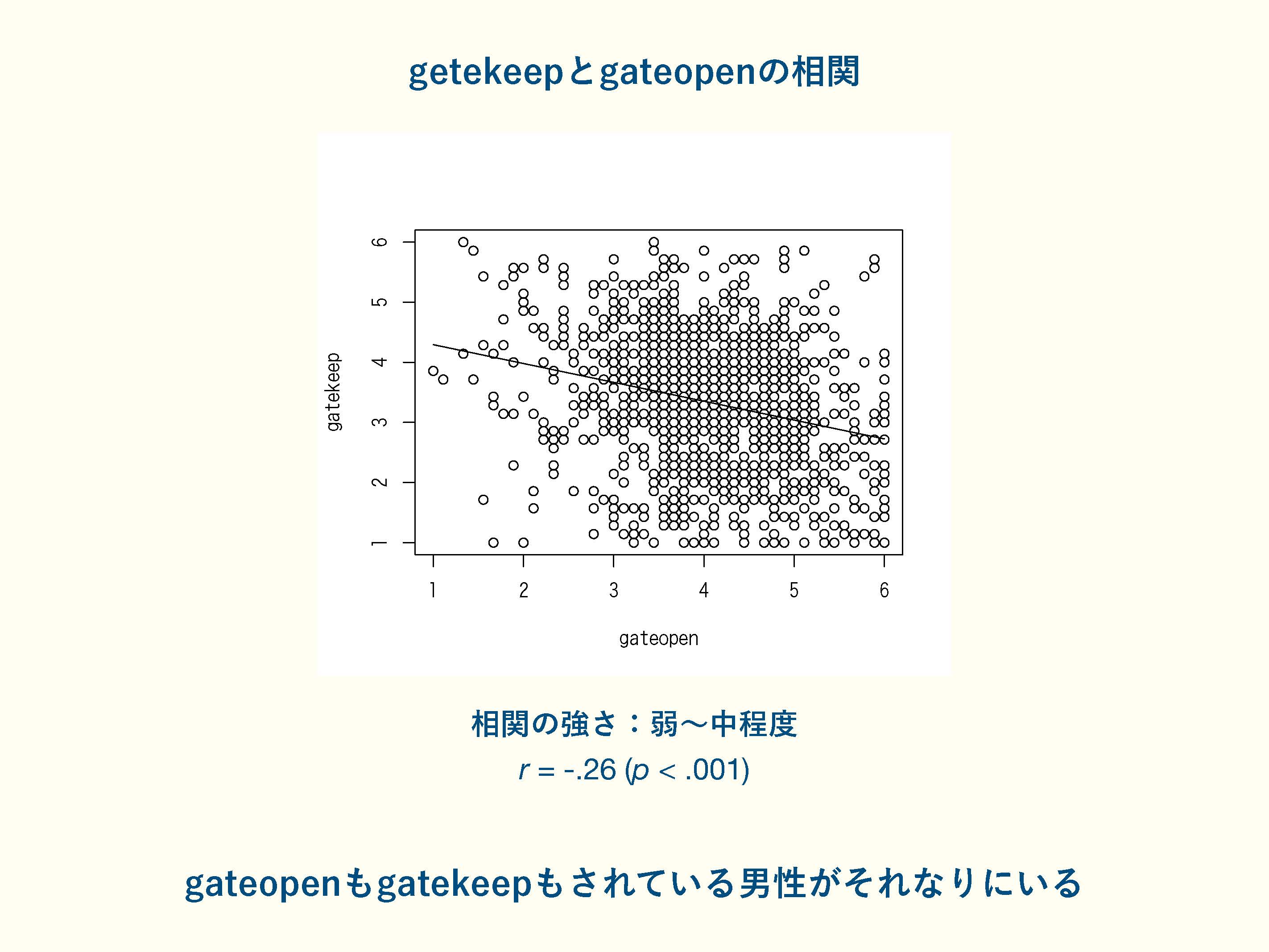 次に、ゲートキーピング(抑制)とゲートオープニング(促進)の相関を見ていきます。ゲートキーピングされている父親が、どのぐらいゲートオープニングされているのか、その関連を見てみると、弱い負の相関があり、ゲートキーピングされている父親もゲートオープニングされており、ゲートオープニングされている父親もゲートキーピングされていることがわかりました(図4)。