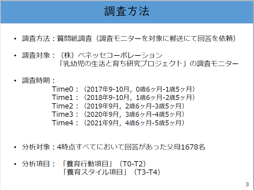 最初に調査方法について説明します(表1)。調査時期は、0歳時期(Time0;0歳6ヶ月~1歳5ヶ月)から4歳時期(Time4;4歳6ヶ月~5歳5ヶ月)までの5つの時点を設け、対象者はすべての回答があった父母1,678名としました。分析項目は、発達段階に合わせて、乳幼児期(0歳時期~2歳時期)は具体的な養育行動に着目する「養育行動項目」、幼児期(3歳時期~4歳時期)は養育の態度やスタイルに焦点を当てる「養育スタイル項目」を設定しました。