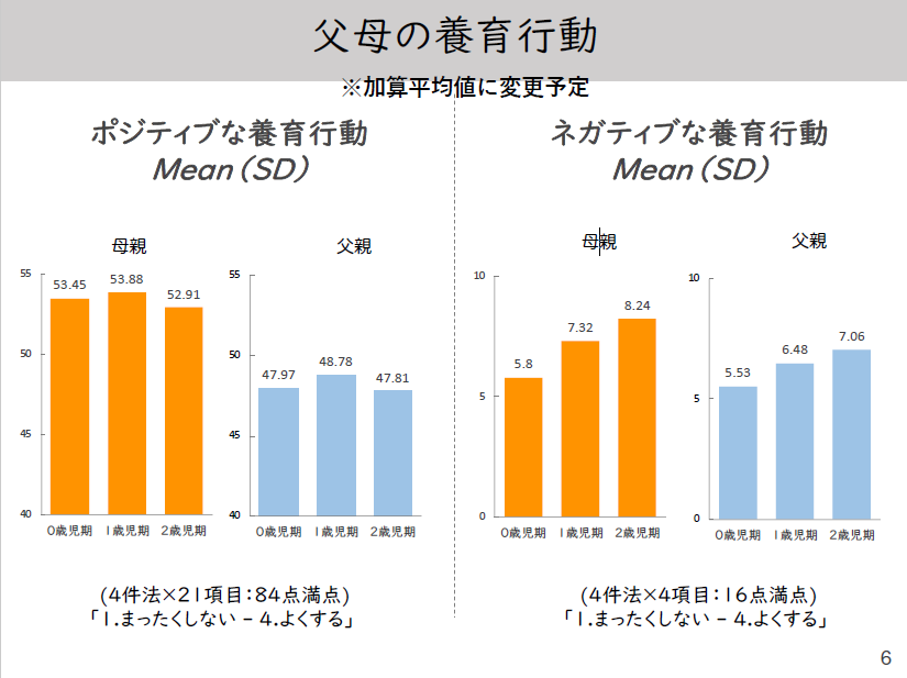 まずは、乳幼児期(0歳時期~2歳時期)の調査結果を説明します。乳幼児期の調査では、「子どもの動作や言葉をまねる」「温かく優しい声で話しかける」など全21項目のポジティブな行動、および「感情にまかせてしかる」「悪いことをしたときにたたく」など全4項目のネガティブな行動について、「1.まったくしない - 4.よくする」の4段階で回答してもらいました。