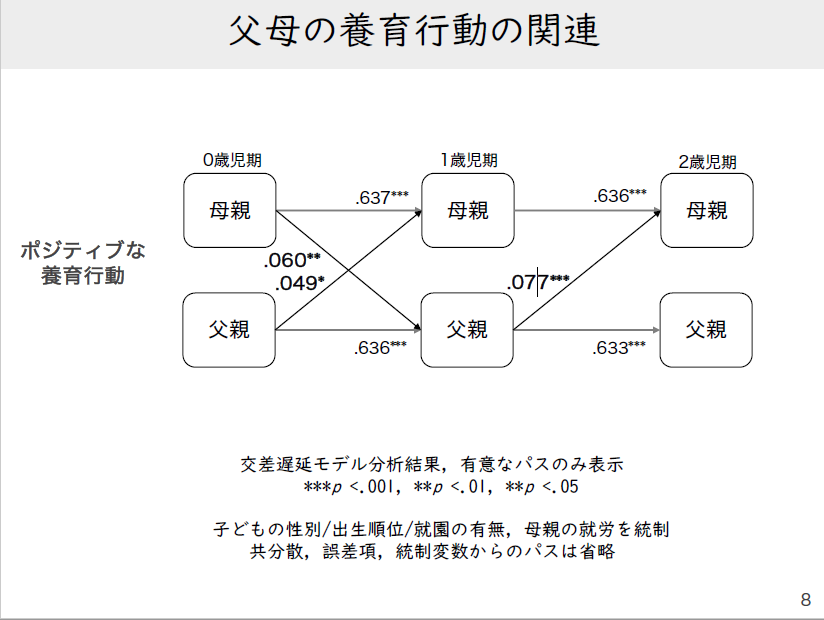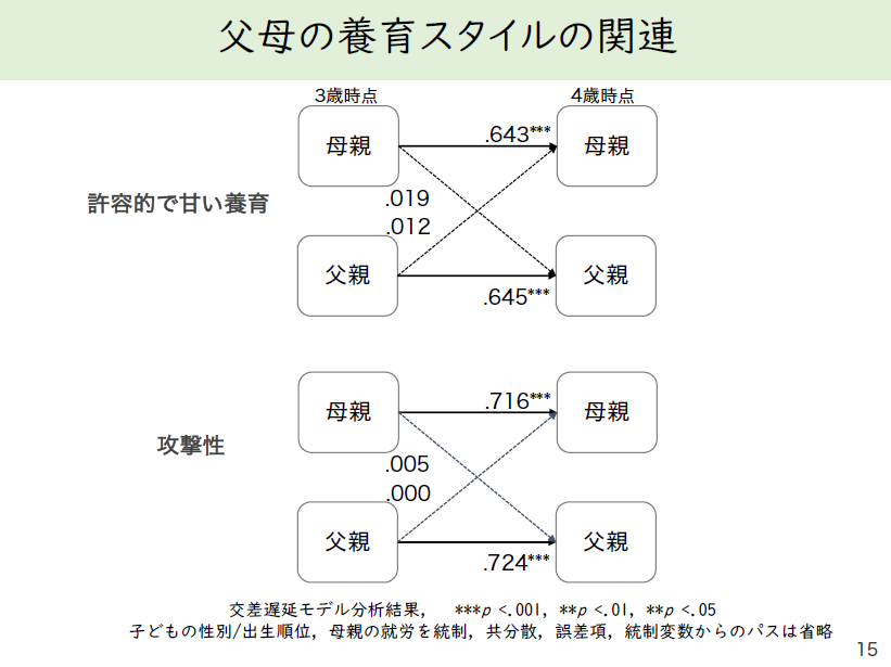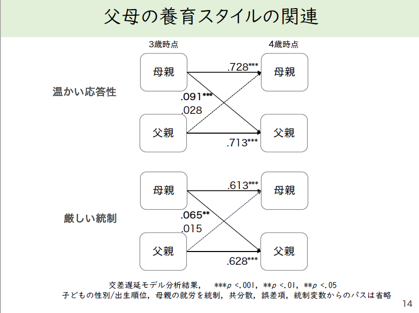 もう1つは、乳幼児期は父母が相互に影響を与え合っていたのに対し、幼児期は母親から父親への一方的な影響が見られたことです。あくまでも推測ですが、母親の方が子どもと接する時間が長いことなどから、その養育スタイルが父親に影響しやすくなるといった要因が考えられるでしょう。