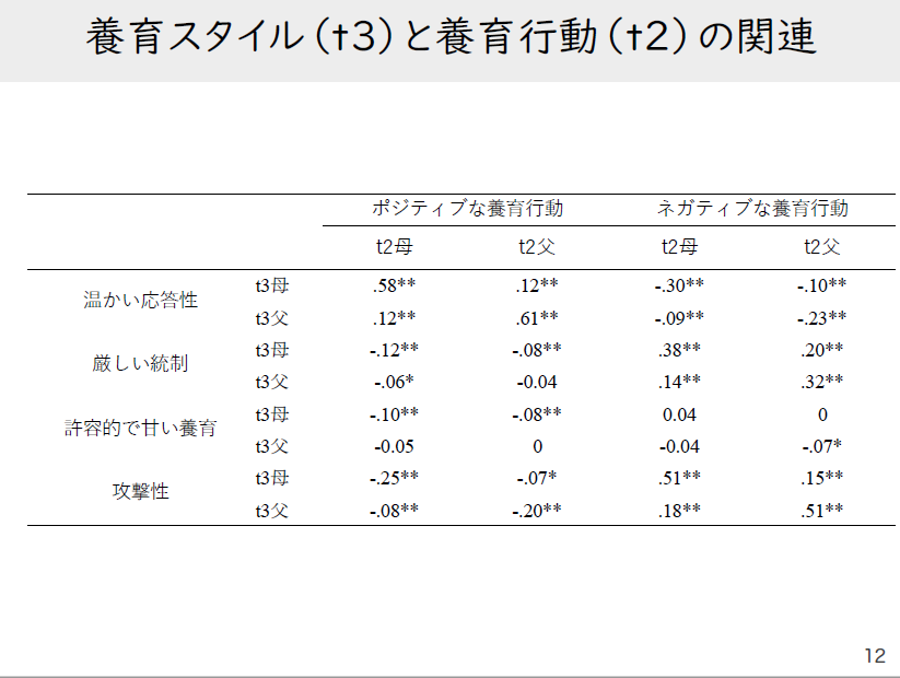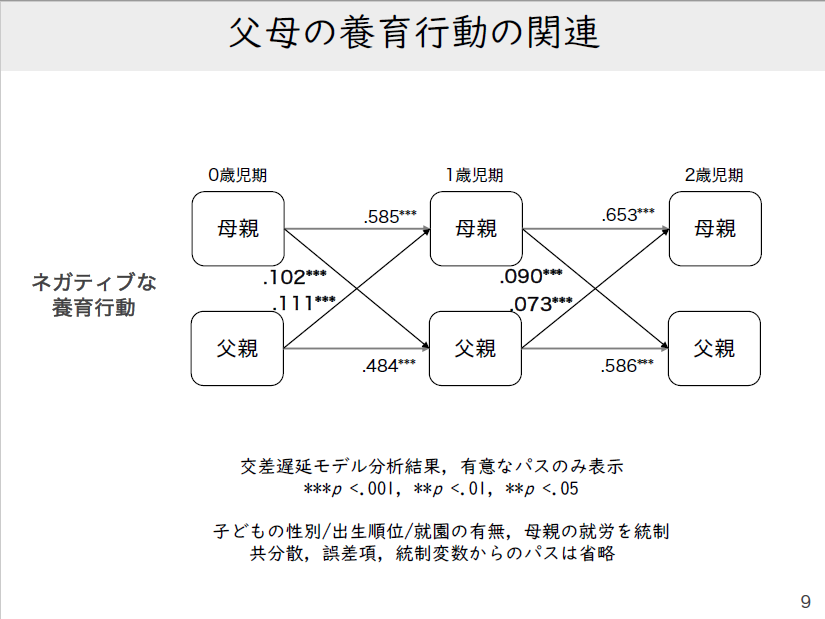 こうした結果から、2つの可能性が示唆されます。1つは、乳幼児期の養育行動では、父母が相互に影響を与えやすいことです。もう1つは、乳幼児期は、ポジティブな養育行動より、ネガティブな養育行動のほうが、より 強い影響を相互に与えやすい可能性があると考えられます。