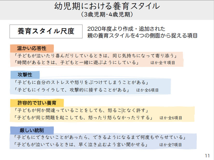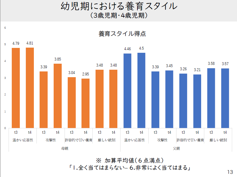 続いて、幼児期(3歳時期~4歳時期)の調査結果を説明します。幼児期は、「温かい応答性」「攻撃性」「許容的で甘い養育」「厳しい統制」の4つの尺度で、父母それぞれの養育スタイルを評価してもらいました(図5)。