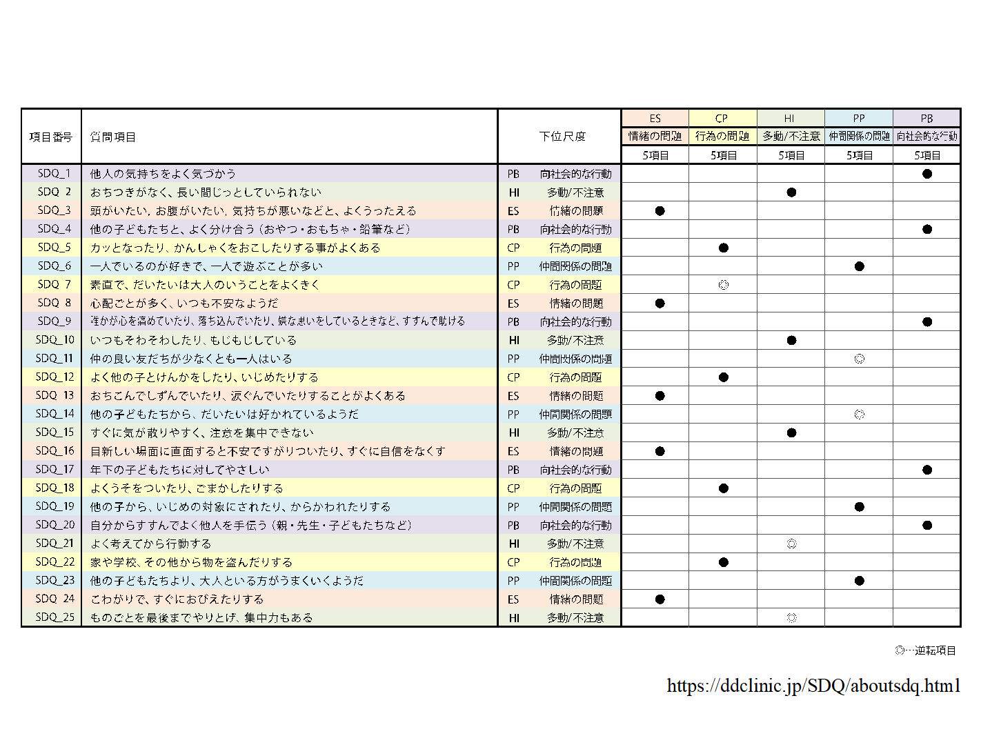 今回の報告では、デジタルメディアの使用時間と、子どもの社会情緒的発達の関連性をテーマとしました。デジタルメディアは、テレビ・DVD、スマートフォン、タブレット、ゲームとし、0〜3歳の1歳ごとに、その時点でのデジタルメディアの使用時間を調査したものを分析に使用しました。社会情緒的発達については、4歳時点の調査で得たSDQ(Strength and Difficulties Questionnaire:子どもの強さと困難さアンケート、詳しい項目は表1)を用い、その得点と、0歳〜3歳のデジタルメディアの使用時間が関連しているかどうかを分析しました。