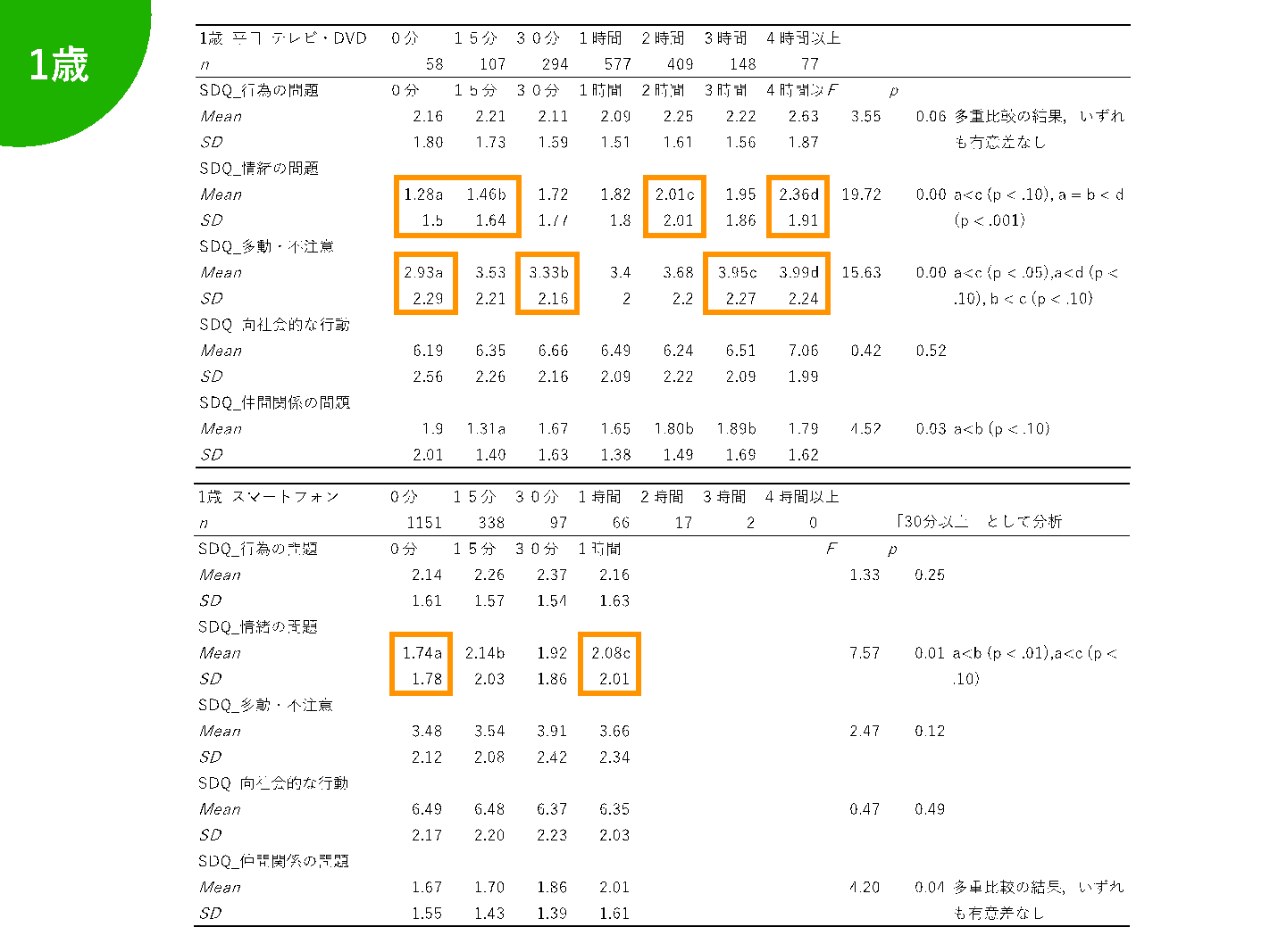 スマートフォンでは、1歳時に全く使っていない子どもたちと比べると、1時間以上使用している子どもたちの方が有意に「情緒の問題」の得点が高く、また2歳時に、全く使っていない子どもたちと比べると、2時間以上使用している子どもたちの方が有意に「多動・不注意」や「仲間関係の問題」が高い傾向が見られました。