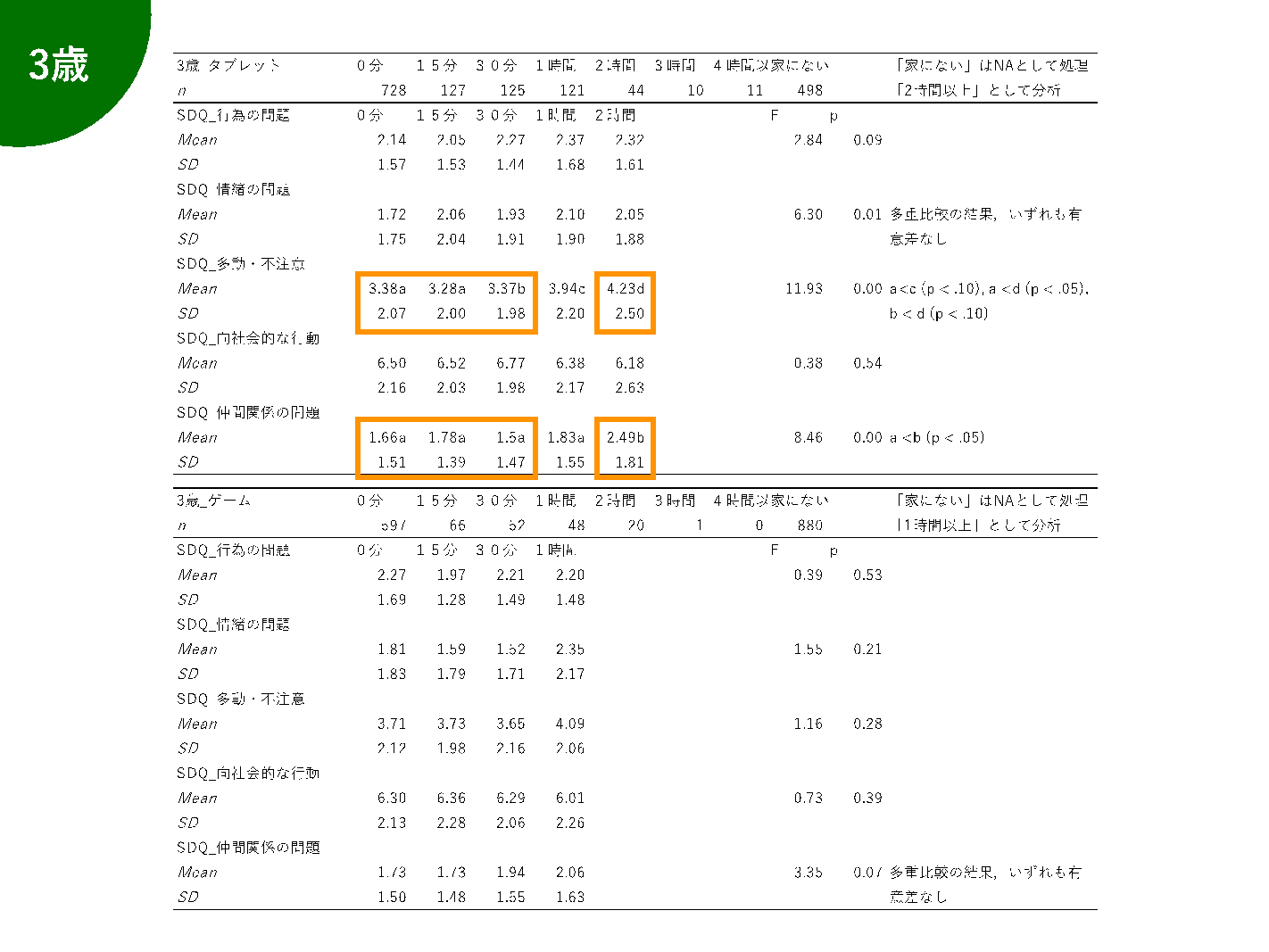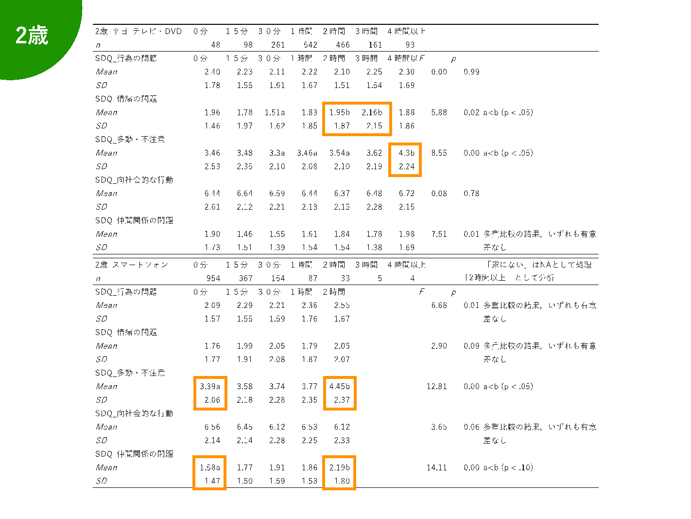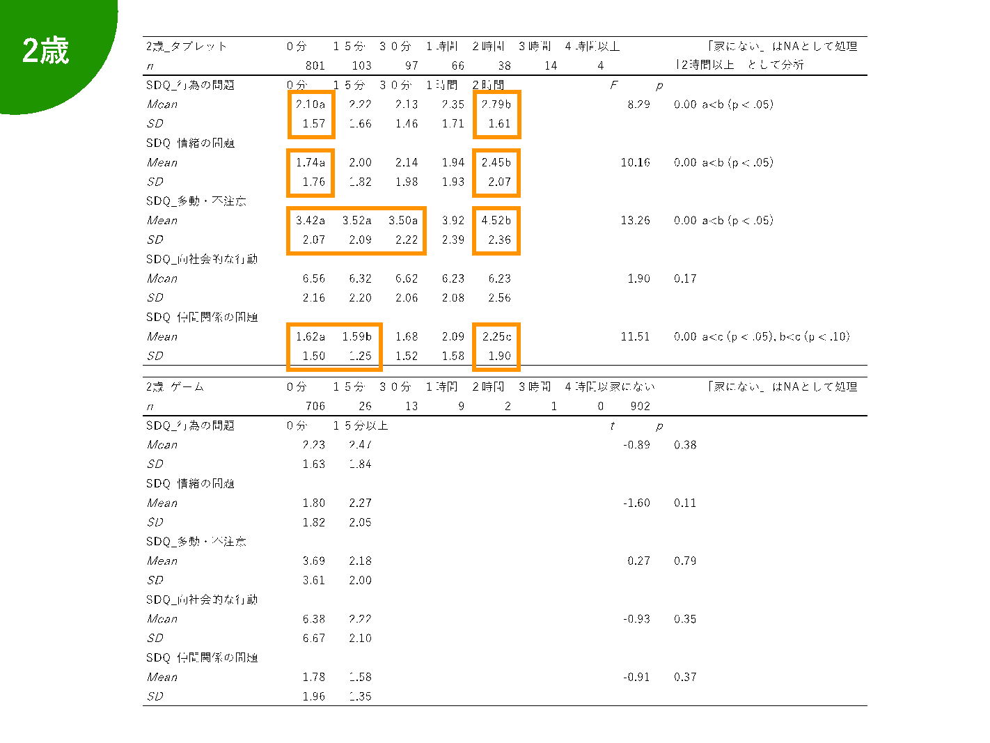 デジタルメディアの使用時間別にSDQの得点を見ていくと、テレビ・DVD、スマートフォン、タブレットでは、概ね2時間以上使用している人たちは、全く使用しない子どもたちや短時間の使用にとどめている子どもたちと比べて、SDQの得点に有意差があることが分かりました。 表2〜5のオレンジの線で囲った部分が、使用時間によってSDQの得点に有意差が見られた部分です。