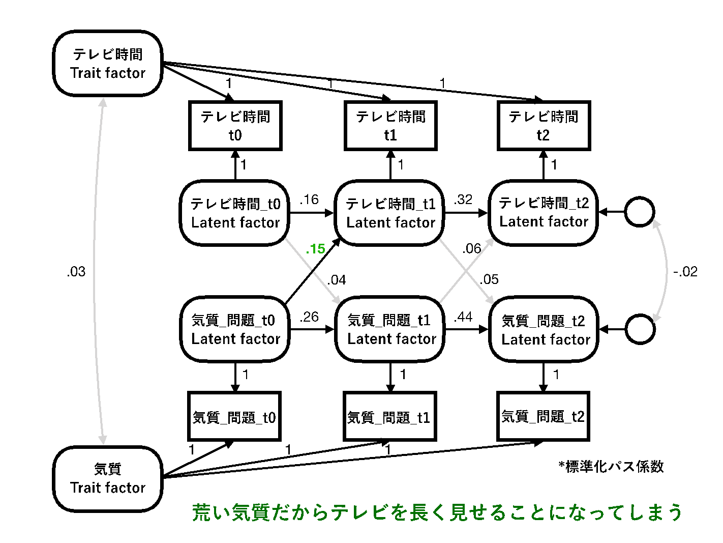 3つの質問項目は、「一度ぐずるとなだめにくい」「かんしゃくを起こしやすい」「ちょっとしたことで激しく泣く」で、4件法での回答を得ています。3つの項目の平均得点を分析に使用しました。分析には、ランダム切片交差遅延効果モデルを使用しました。これは、2つの変数の因果関係を推定できる方法です。