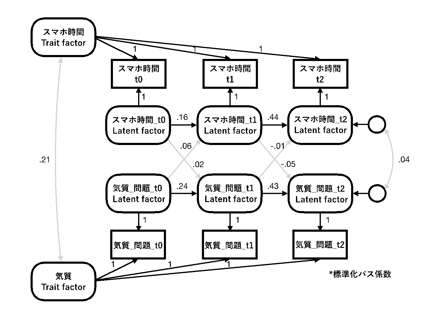 なお、同様に、スマートフォンの使用時間と気質との関連を分析しましたが、いずれの因果関係も有意ではありませんでした(図2)。