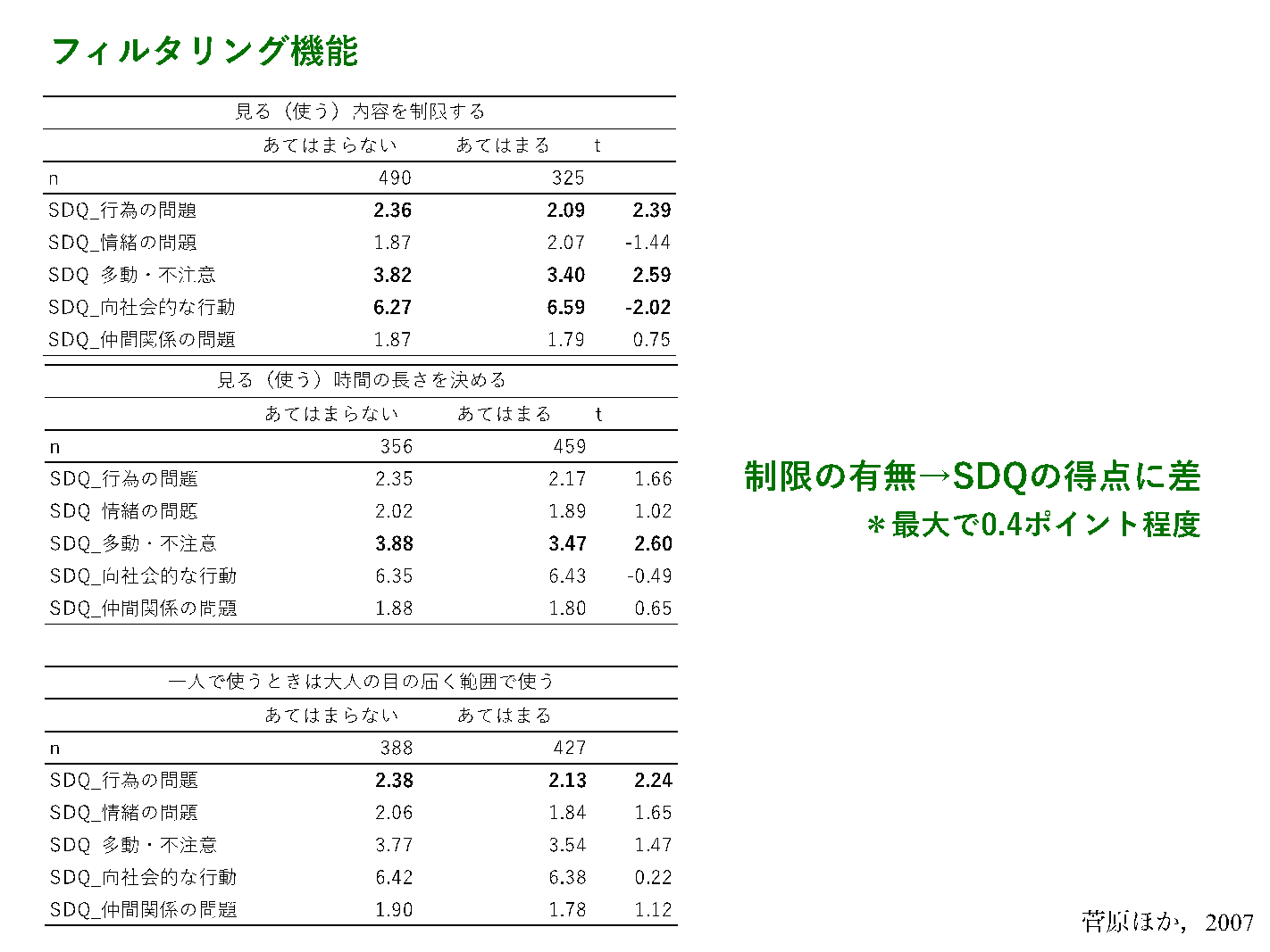 なお、ゲームに関しては、3歳時点でも2時間以上使用している子どもたちが少なかったため、長時間使用の影響について検討することができていません。ただ、少なくとも1時間くらいまでの使用については、今回の分析では4歳時のSDQの得点と有意差は見られませんでした。