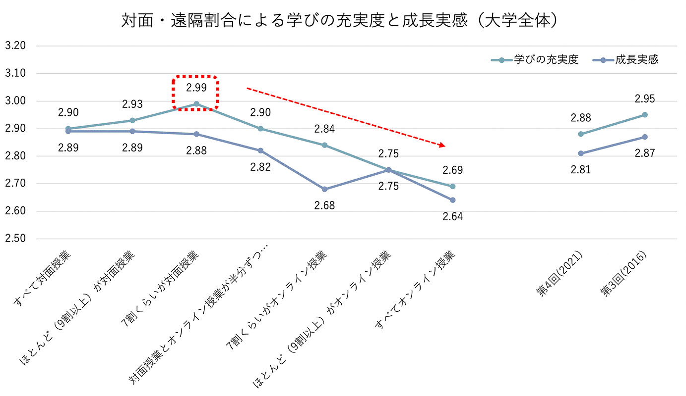 大学教育におけるコロナ禍での最大の変化は、遠隔授業の普及です。どの大学でも遠隔授業が定着し、ポストコロナでも対面授業との併用が続くと考えられます。山田教授はその点に着目し、大学生の学びと成長を促すための両者の最適なバランスを考察するために、対面授業と遠隔授業の割合を7つに区分して、学びと成長に関する分析を行いました。