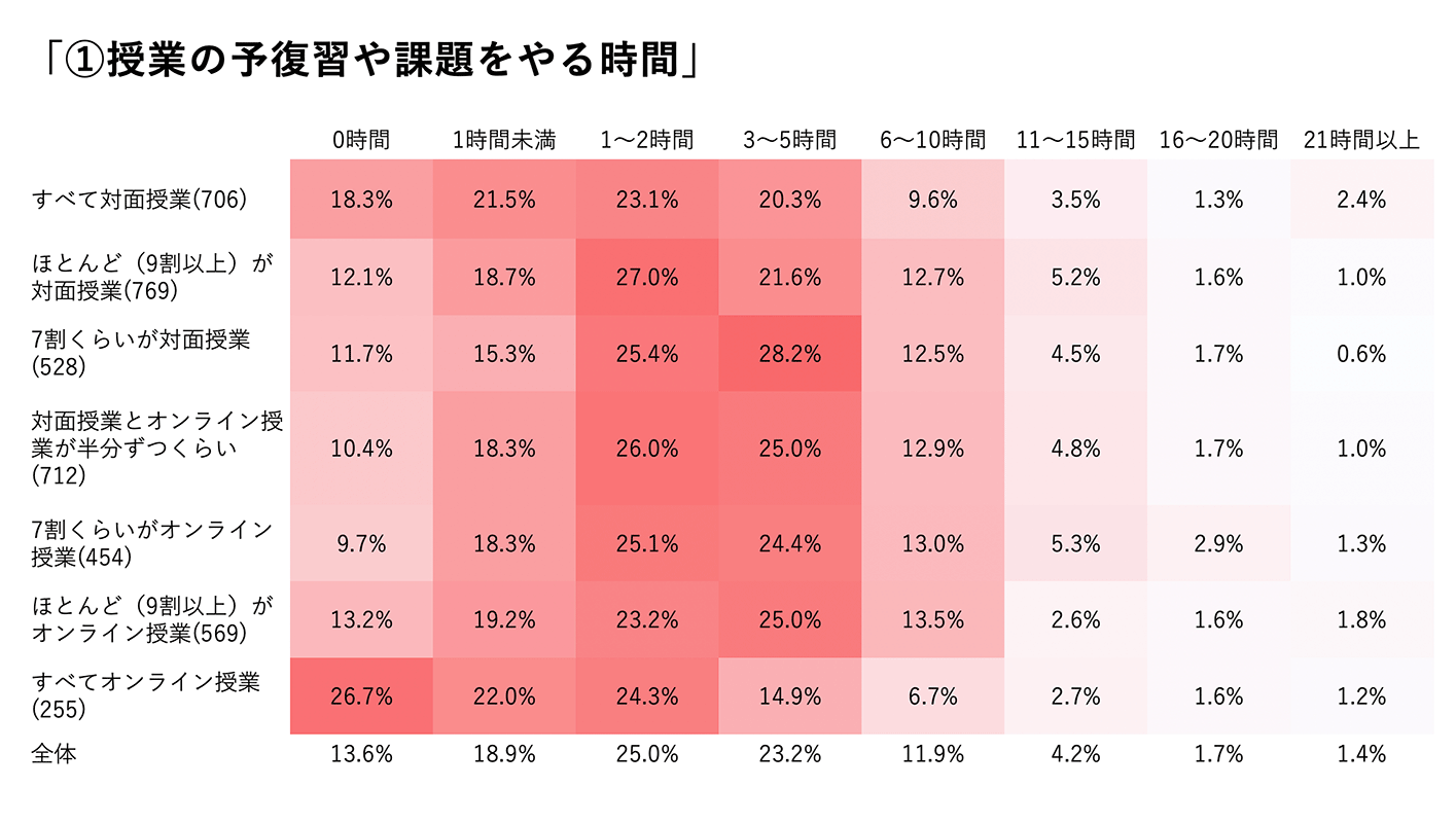 次に、対面授業と遠隔授業の割合と、学びの質の関連を見ていくと、遠隔授業の割合が3割以上になると、学びの充実度や授業への動機づけ、教育満足度が低下していました(図10)。学習時間においても、対面7:遠隔3が分岐点となり、遠隔授業が3割以上になると、「授業の予習復習や課題をやる時間」「大学の授業以外の自主的な学習」が少なくなる傾向が見られました(図11)。