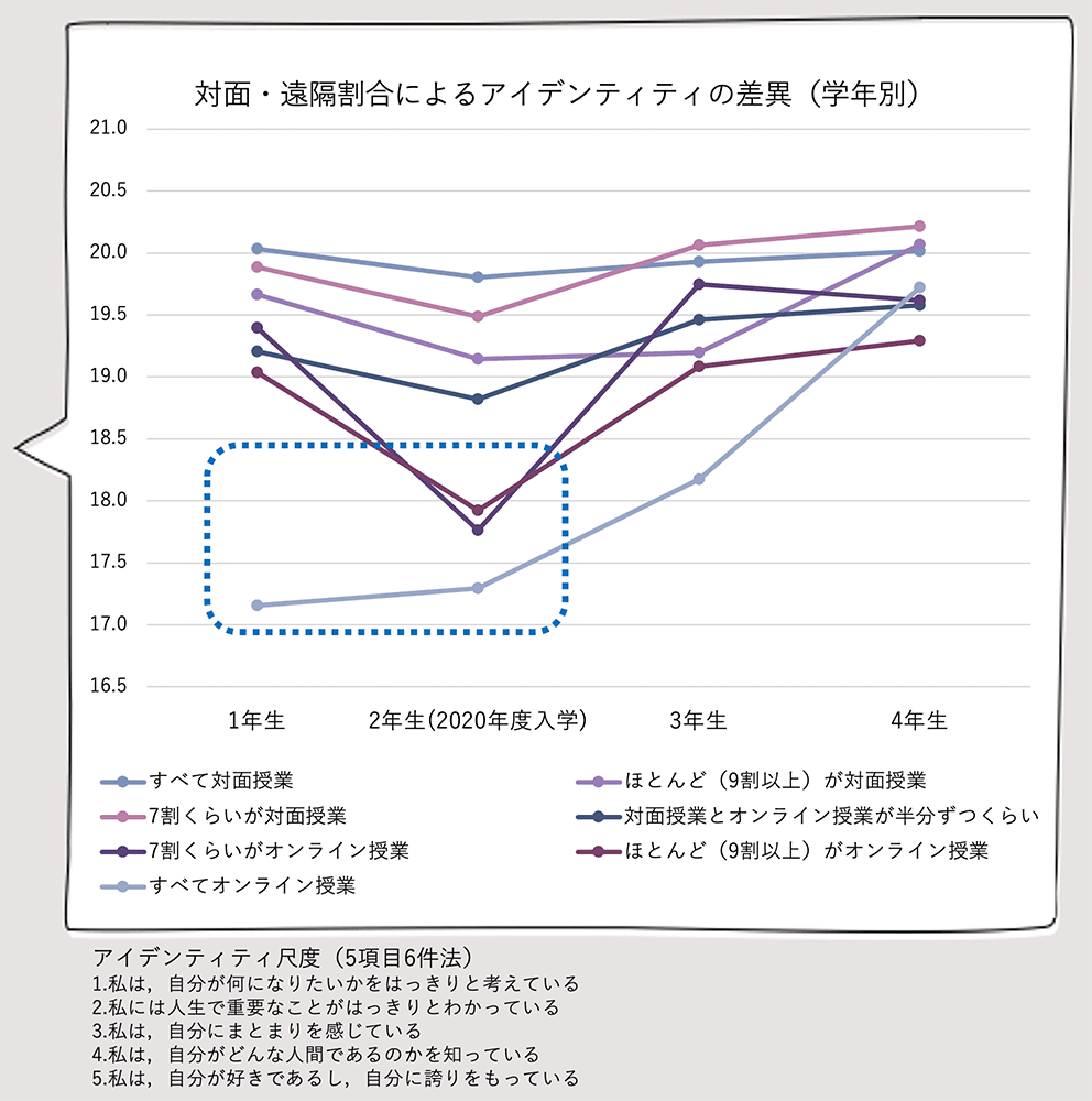 一方、アイデンティティやレジリエンスといった成長の指標を学年別に見ていくと、2020年度入学生(調査時2年生、現3年生)、2021年度入学生(調査時1年生、現2年生)はともに、遠隔授業の比率が高い学生はいずれのスコアも低いという結果でした。ただし、対面授業の比率が高ければ、スコアは他学年と大きな違いはありません(図12)。