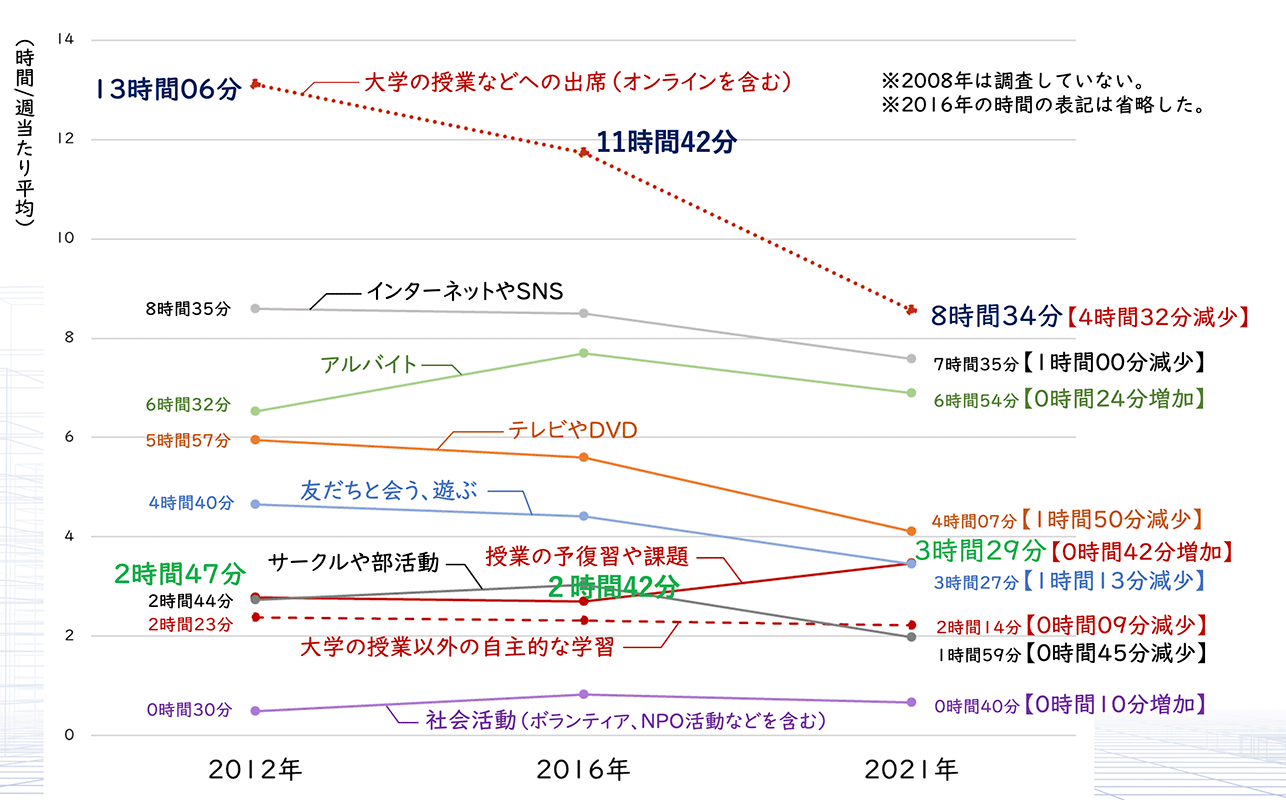 川嶋特任教授からは、まず自身の課題意識を基に大学生の学習時間に焦点をあてた考察がなされました。大学生の1週間の生活時間を図示し、授業内学習時間が徐々に減少している一方で、横ばいだった授業外学習時間は第4回調査(2021年調査)で増加したことを示しました(図13)。いずれも、遠隔授業の影響が考えられるものの、1単位は45時間の学修を要する規定から考えると学習時間は明らかに少なく、大学生の学習量は依然として重要な問題であると指摘しました。