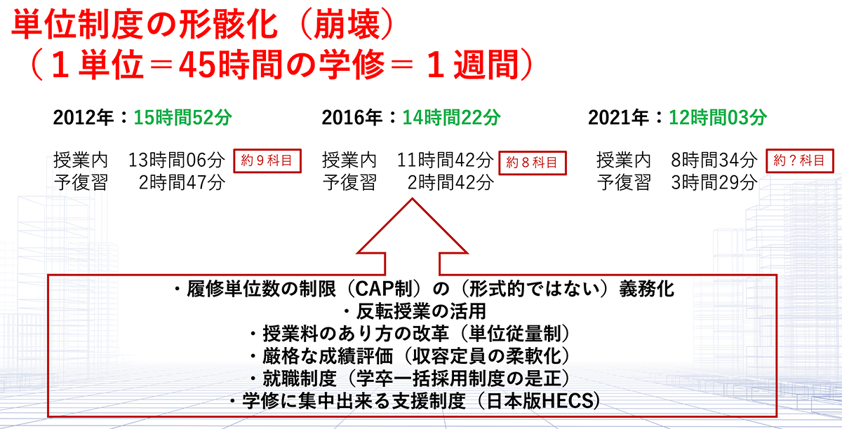 「その解決には、履修単位数の上限設定(CAP制)の義務化、厳格な成績評価を実行化するために収容定員の柔軟な運用、アルバイトなどをせずに学習に集中できる奨学金制度などを検討すべきでしょう(図14)」(川嶋特任教授)