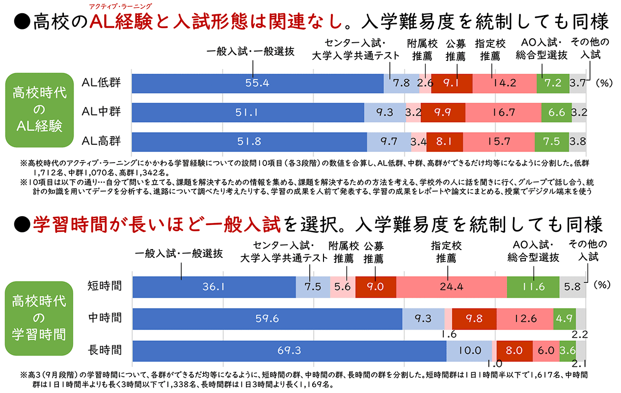 木村:高校時代のALの経験の多さと入学者選抜の関連を見てみましたが、両者には明確な関連性は見られませんでした(図15)。総合型選抜を受験しようと考えるならば、高校時代に探究的な学びを多く経験してもよいのではないかと思いますが、入試では必ずしもそこが問われていないのだと感じさせる結果でした。