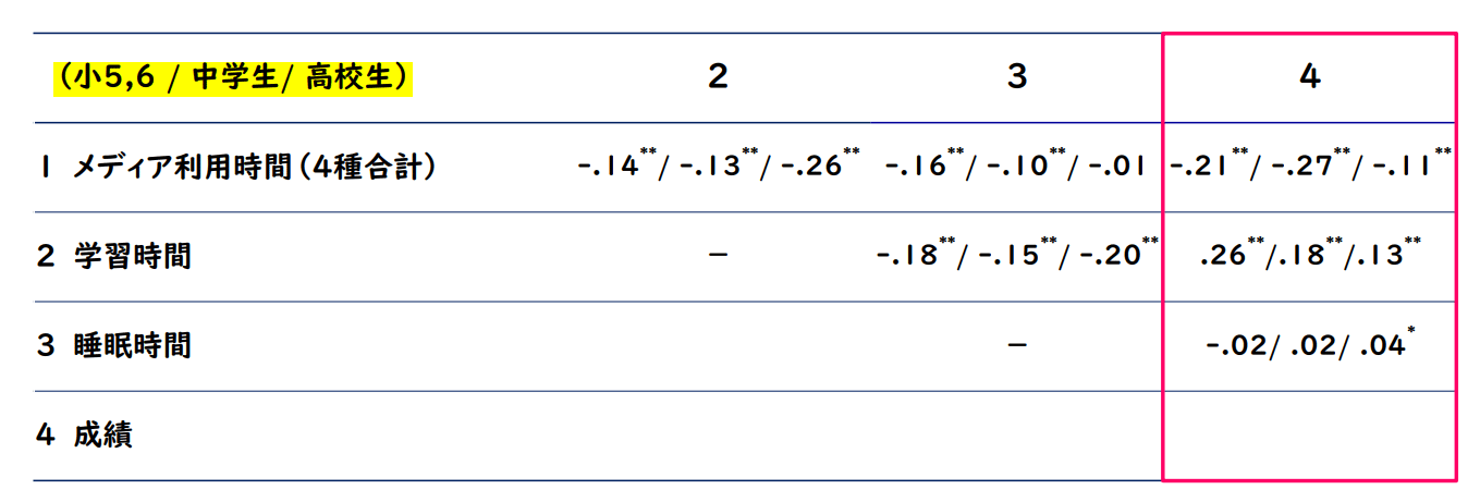 このメディア利用時間と、学習時間、睡眠時間、成績との関連を分析すると、メディア利用時間は、それ以外の変数と負の相関がありました。また、成績は、学習時間と正の相関があり、睡眠時間と相関はありませんでした。これらの結果は、小学生・中学生・高校生でほぼ同じような結果でしたが、相関係数はそれほど大きくはありません(図4)。